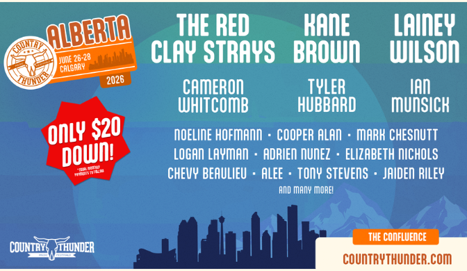 The Confluence Historic Site & Parkland Country 105 welcomes Country Thunder Alberta Calgary June 26 – 28 with these massive headliners! HEADLINERS The Red Clay Strays Kane Brown Lainey Wilson DIRECT SUPPORT Tyler Hubbard Ian Munsick Cameron Whitcomb SECONDARY ACTS Noeline Hofmann, Mark Chesnutt, Logan Layman, Adrien Nunez, Elizabeth Nichols, Chevy Beaulieu, Alee, Tony Stevens, Jaiden Riley, And more