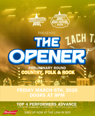 Cowboys Dance Hall THE OPENER 2026 Presented by Cowboys Dance Hall & Cowboys Music Festival Preliminary Round #5: COUNTRY, ROCK, BANDS, ETC. Friday March 6th, 2026 DOORS @ 8PM / PERFORMANCES START @ 8:30PM Come down to support and vote for 50+ local & legendary artists while they compete for an opening spot on the CMF30 2026 Stage!