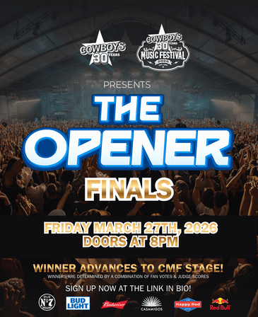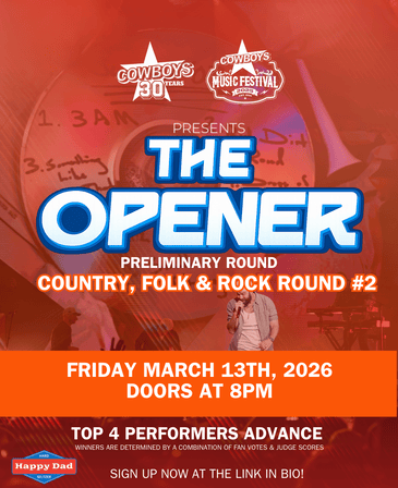 Cowboys Dance Hall THE OPENER 2026 Presented by Cowboys Dance Hall & Cowboys Music Festival Preliminary Round #6: COUNTRY, ROCK, BANDS, ETC. Friday March 13th, 2026 DOORS @ 8PM / PERFORMANCES START @ 8:30PM Come down to support and vote for 50+ local & legendary artists while they compete for an opening spot on the CMF30 2026 Stage!